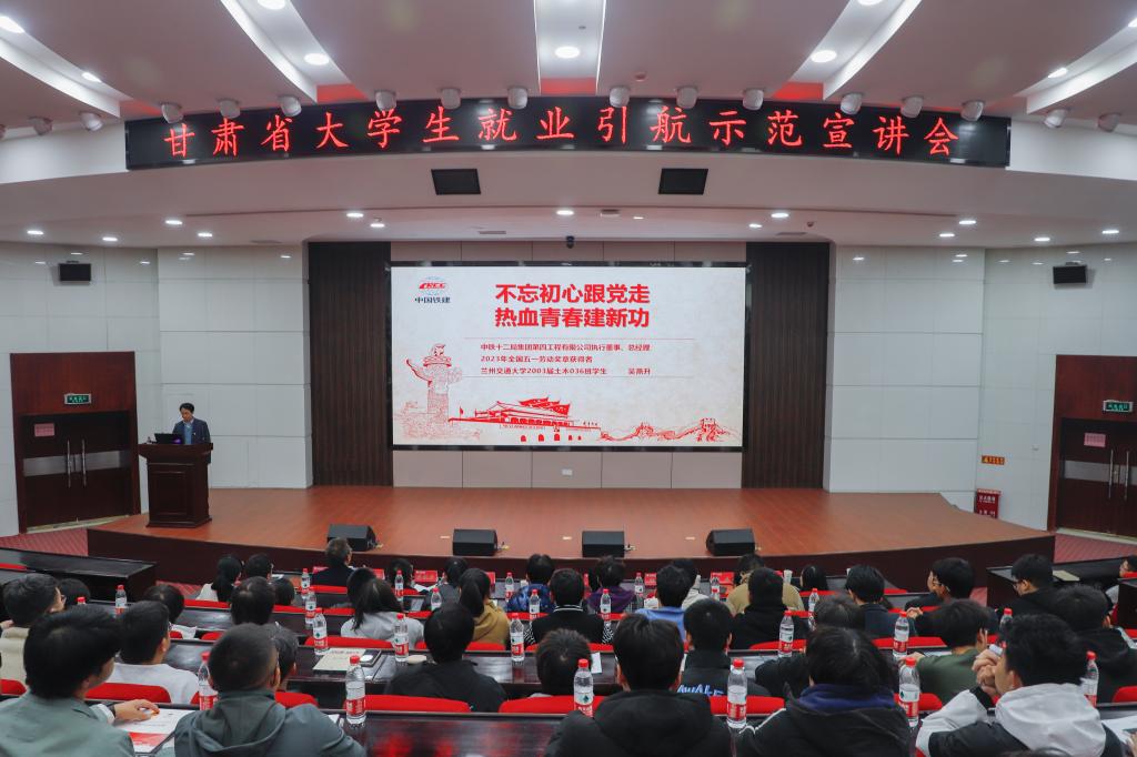 11月16日下午,甘肃省大学生就业引航计划秋季学期首场示范宣讲会在兰州交通大学尚德楼大报告厅举行。全国五一劳动奖章获得者、兰州交通大学土木工程学院校友、中铁十二局集团第四工程有限公司执行董事、总经理、党委副书记吴燕升应邀来校,为广大师生作了题为“不忘初心跟党走热血青春建新功”的就业引航专题宣讲。共青团甘肃省委学校部负责人,校团委、校友办、招生就业处等职能部处相关负责人,土木工程学院党委负责人,兰州交通大学第16期青马班学员、土木工程学院学生代表共300余人参加宣讲会。