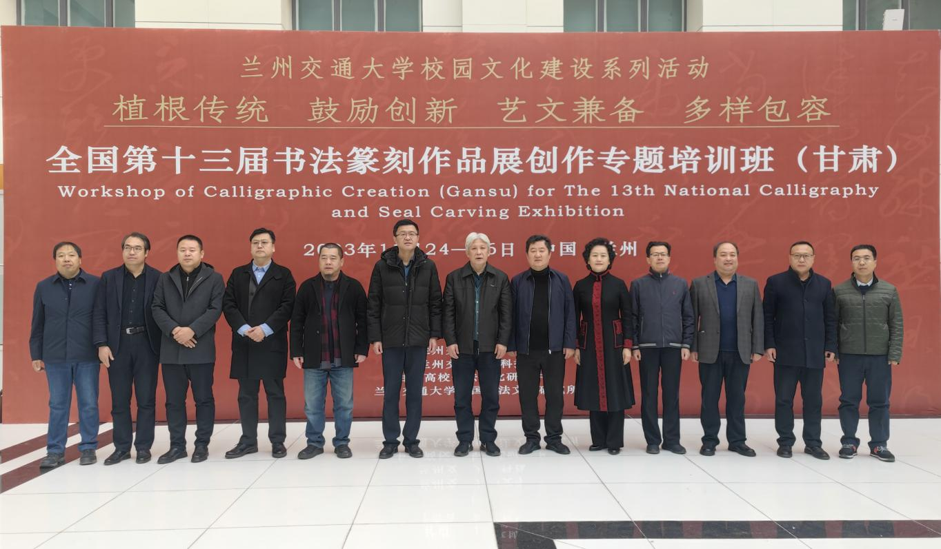11月24日上午,全国第十三届书法篆刻作品展创作专题培训班开班仪式在兰州交通大学尚德楼三楼大报告厅举行。中国文联书法艺术中心原主任、中国书法家协会学术委员会原副主任刘恒,中国书法家协会草书委员会委员栾金广、刘长龙,全国(教育)书画协会常务理事、河南省书法家协会理事程志宏,中国书法家协会会员、西泠印社社员汤忠辉,甘肃省文联党组成员、副主席张有为,中国书法家协会理事、甘肃省文联副主席、甘肃省书法家协会主席安文丽,中国书法家协会理事、甘肃省书法家协会常务副主席陈新长,甘肃省书法家协会副主席张万胜、汪志刚、李维君,秘书长赵玉民,我校党委副书记贡力出席开班仪式,兰州交通大学原副校长马军党主持了专题讲座,开班仪式由甘肃省书法教育中心负责人主持。
