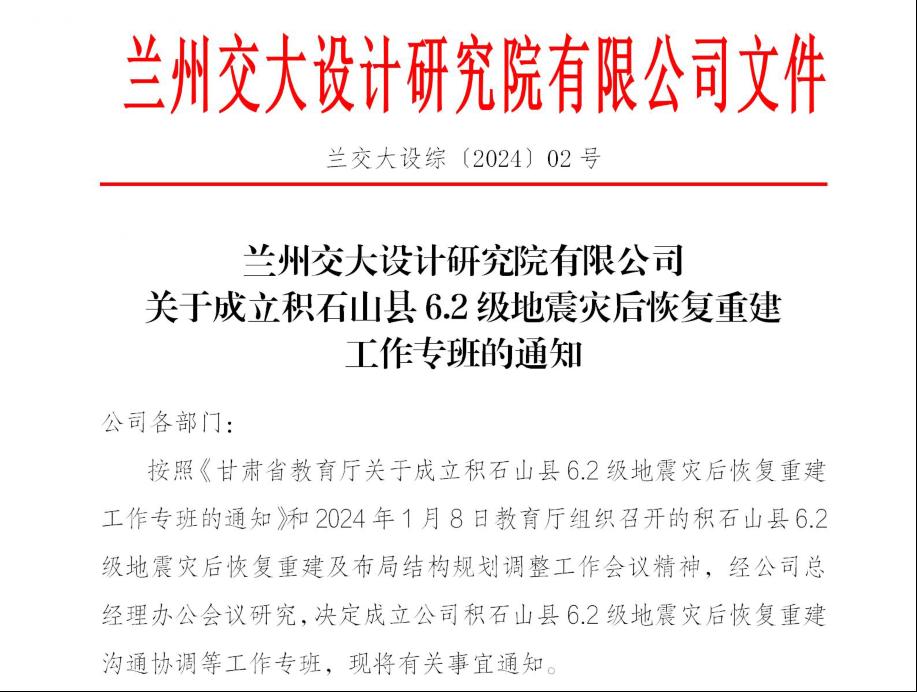 按照《甘肃省教育厅关于成立积石山县6.2级地震灾后恢复重建工作专班的通知》和2024年1月8日教育厅组织召开的积石山县6.2级地震灾后恢复重建及布局结构规划调整工作会议精神,学校设计院立即行动,坚决贯彻省教育厅、学校党委工作部署安排,迅速成立积石山县6.2级地震灾后恢复重建领导统筹专班、沟通协调专班、工程质量督导专班、设计图纸(方案)质量审查专班、项目设计工作专班、保障工作专班等六个内部工作专班,切实践行高校校属企业的社会责任与担当。