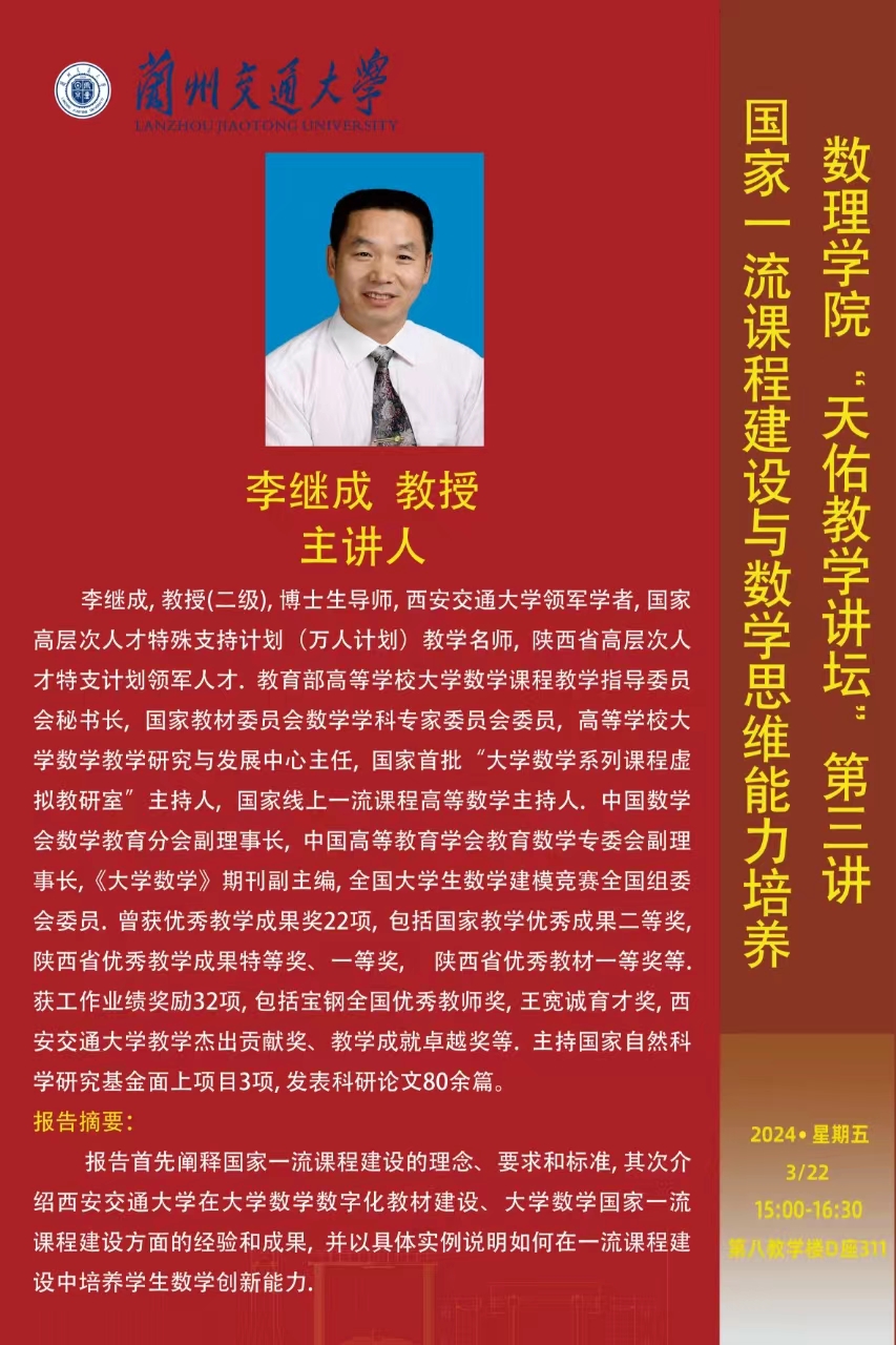 为抢抓机遇、提质增效,更好地推进国家一流课程建设申报工作, 3月22日下午,教育部高等学校大学数学课程教学指导委员会秘书长、西安交通大学数学与统计学院副院长李继成, 北京航空航天大学佘志坤教授一行应邀来到数理学院开展“天佑教学讲坛”交流活动。活动由兰州交通大学副校长霍海峰主持,数理学院领导班子及学院全体一流课程负责人、参与人员20余人参加了活动。