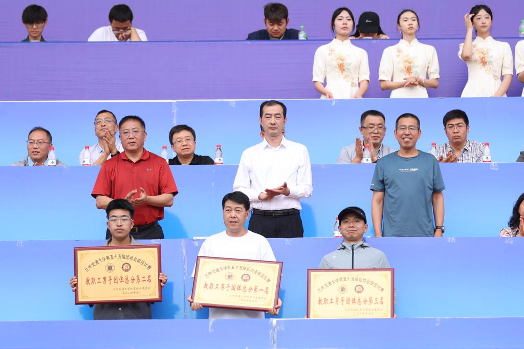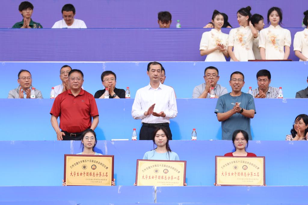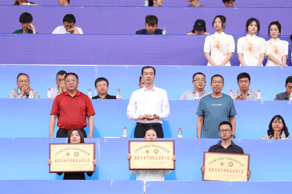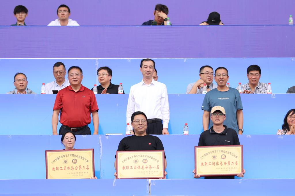 在热烈的掌声和阵阵欢呼声中,兰州交通大学第五十五届运动会圆满落下帷幕。经过三天激烈角逐,土木工程学院、附属中学、自动化与电气工程学院获得教工团体总分前三名;土木工程学院、自动化与电气工程学院、机电工程学院获得大学生团体总分前三名;机电工程学院、自动化与电气工程学院学院、电子与信息工程学院、土木工程学院获得优秀单位组织奖。
