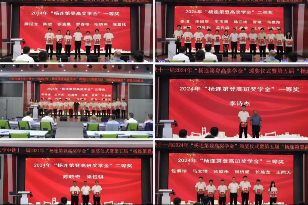 学校招生就业处负责人宣读了兰州交通大学中铁十一局2024年“杨连第登高奖学金”表彰决定,与会领导分别为“杨连第登高奖学金”“杨连第登高班奖学金”获奖学生颁奖。