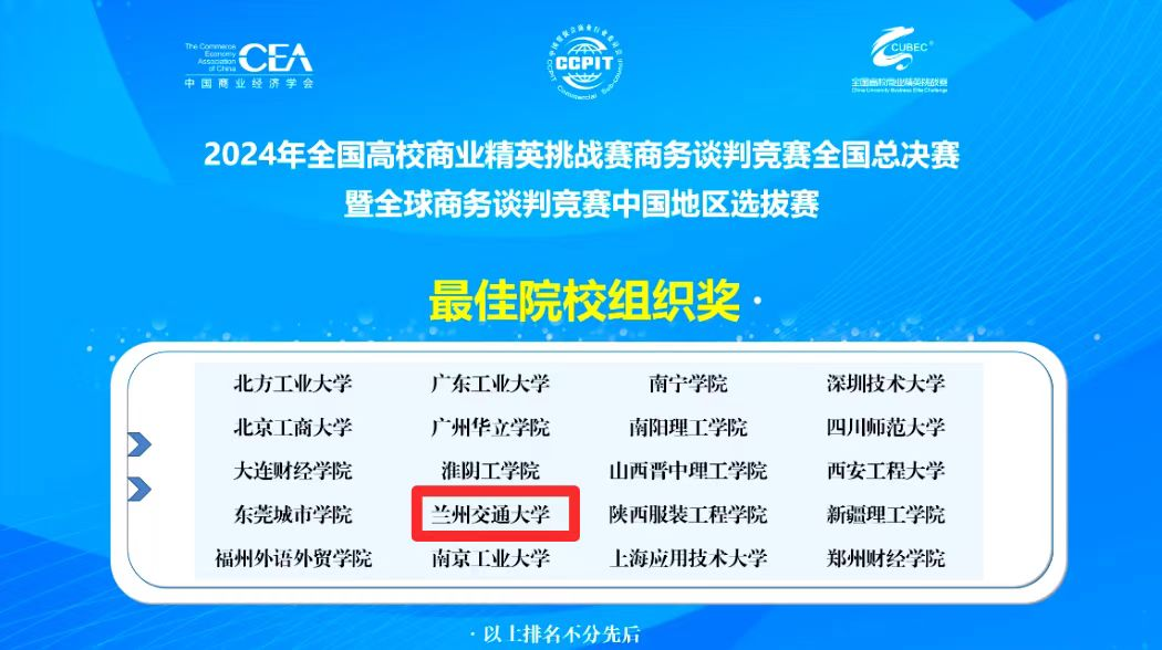 11月2日,由中国国际贸易促进委员会商业行业委员会、中国国际商会商业行业商会与中国商业经济学会共同主办的2024年全国高校商业精英挑战赛商务谈判竞赛全国总决赛暨全球商务谈判竞赛中国地区选拔赛于线上成功举办。我校共有7支队伍入围,经过层层选拔和激烈角逐,最终获得一等奖1项,二等奖3项,三等奖3项,同时荣获最佳院校组织奖。