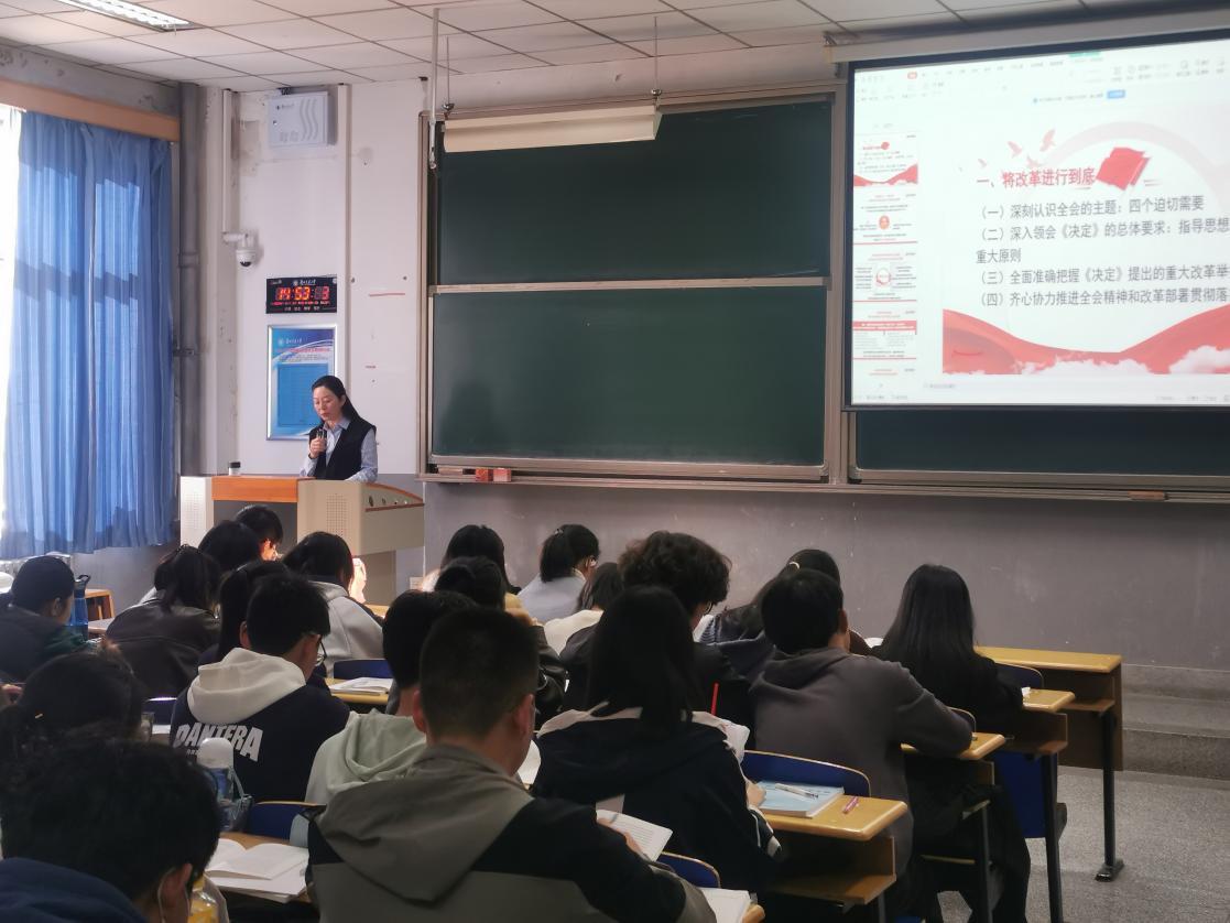 为深入学习贯彻习近平总书记对学校思政课建设作出的重要指示精神,持续推动习近平新时代中国特色社会主义思想进教材进课堂进头脑,贯彻落实学习好党的二十届三中全会精神,11月8日下午,校党委常委、纪委书记王珺深入课堂,为2024级通信工程专业的本科生讲授《形势与政策》课。