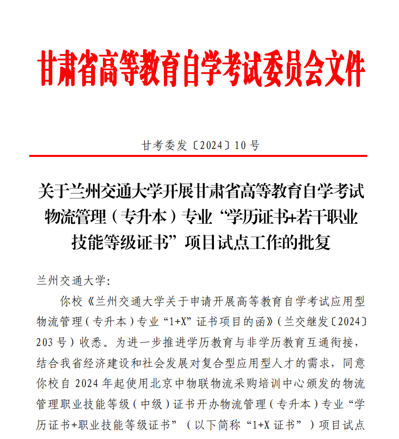作为甘肃省高等教育自学考试应用型物流管理(专升本)专业1+X证书项目试点院校,继续教育学院承担主体责任。依据自学考试专业计划要求和职业技能等级证书标准,加强对证书的报名组织、课程培训、成果认定等环节的衔接和管理。通过深化助学方式改革,提升考生应用能力水平和人才质量,提高证书过关率,促进“1+X证书”试点项目在我省的健康发展。