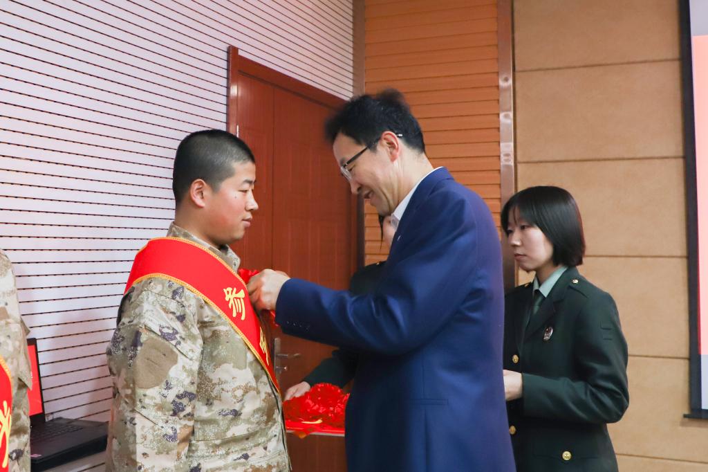 学校学生工作部(处)、武装部负责人介绍了入伍新兵的基本情况。退役复学在校大学生代表送上象征“接力棒”的绶带,学校相关学院负责人分别为入伍新兵佩戴绶带。