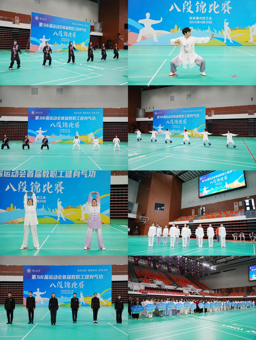 4月26日上午,兰州交通大学第五十六届运动会首届教职工健身气功八段锦比赛在北校区体育馆圆满落幕。本次比赛由校体委主办,校工会承办,体育部、后勤保障部及学校健身气功协会协办,以“传承文化·强健体魄·凝聚合力”为主题,旨在贯彻落实“全民健身计划”和甘肃省教育厅推广传统体育项目的工作部署,展现新时代高校教职工的精神风貌。党委副书记王爱平,副校长陈光武,相关部门负责人出席开幕式。