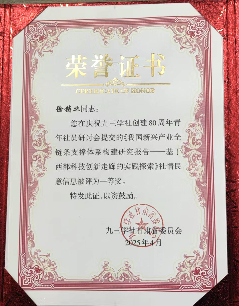 本次研讨会以“弘扬五四精神,担当时代使命”为主题,旨在深入学习贯彻中共二十大精神,庆祝九三学社创建80周年,纪念“五四运动”106 周年。为提升青年社员履职能力和议政建言水平,研讨会对提交的60余份社情民意信息进行评审,并评选出12篇优秀社情民意信息,我校徐铸业教师提交的《我国新兴产业全链条支撑体系构建研究报告——基于西部科技创新走廊的实践探索》社情民意信息获评一等奖,体现了我校九三学社青年社员昂扬向上的精神风貌和意气风发的青春风采。