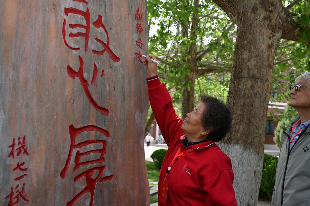 在唐臣广场“憨厚”石前,校友们共同执笔,为他们十年前捐赠的石刻描红,这座见证无数交大学子成长的景观石,在朱砂点染间焕发新生。