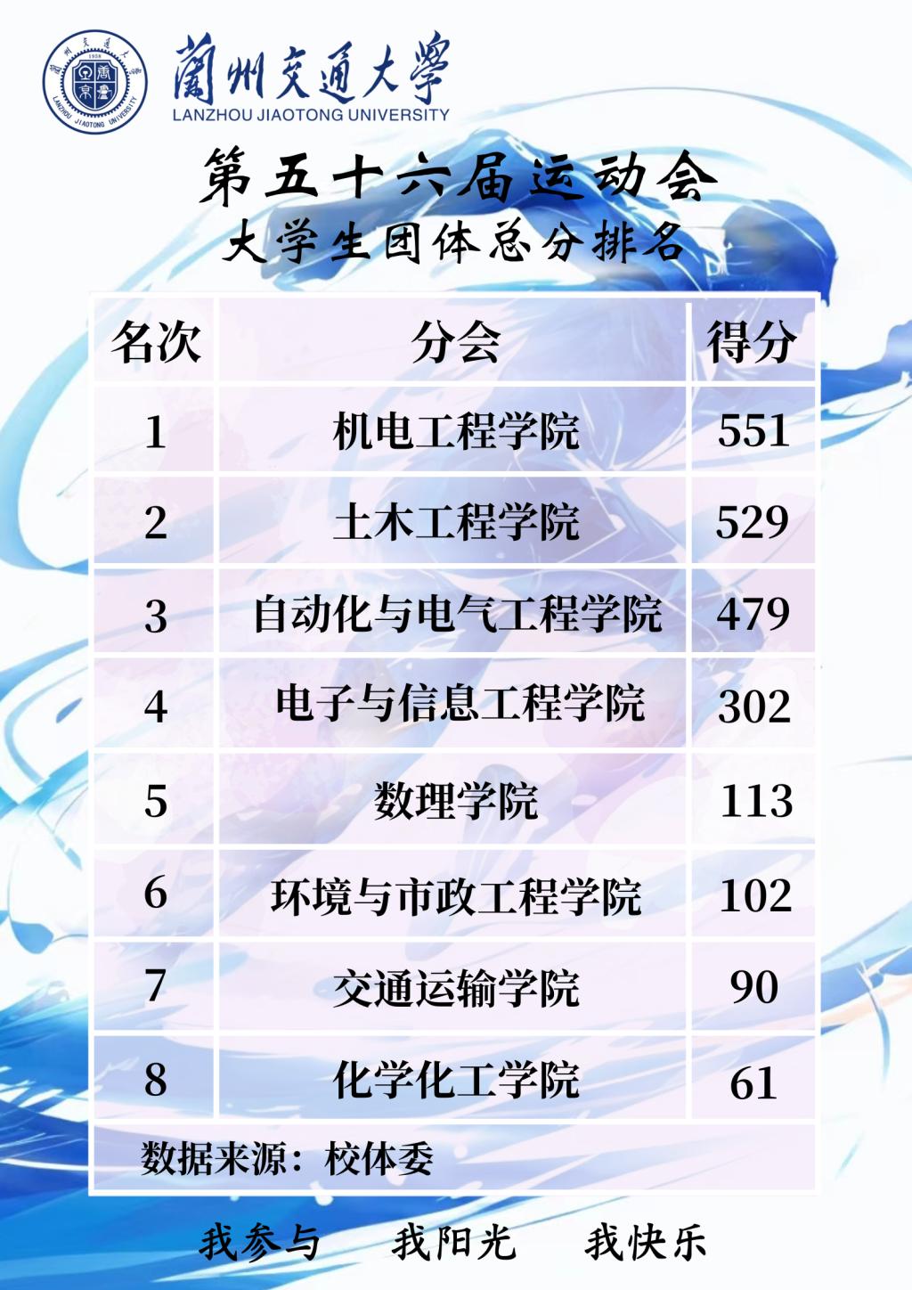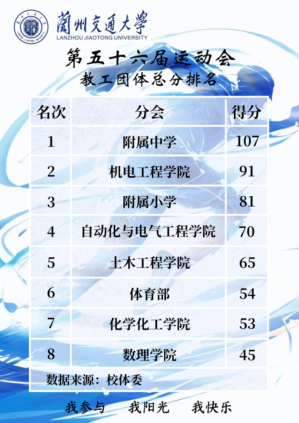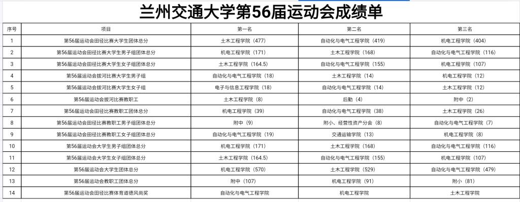 经过三天的激烈角逐,附属中学、机电工程学院、附属小学获得教工团体总分前三名;机电工程学院、土木工程学院、自动化与电气工程学院获得大学生团体总分前三名;自动化与电气工程学院、机电工程学院、土木工程学院获得体育道德风尚奖。