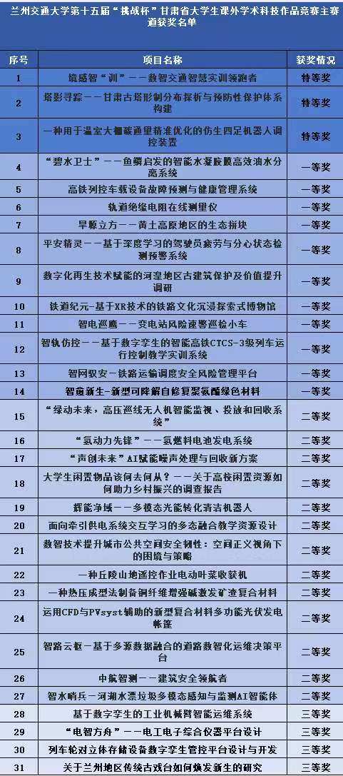6月17日至20日,由共青团甘肃省委、甘肃省教育厅、甘肃省科学技术协会、甘肃省学生会联合会共同主办的第十五届“挑战杯”甘肃省大学生课外学术科技作品竞赛终审决赛在兰州石化职业技术大学举办。校党委常委、副校长朱廷珺出席闭幕式,校团委相关负责同志、参赛团队代表及观摩团参加了决赛现场活动,与各大高校同台竞技、激烈角逐。