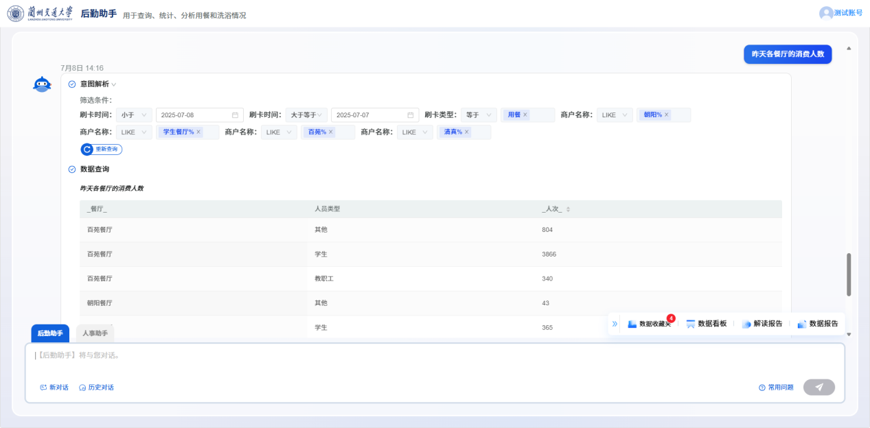交大AI问数以后勤管理为核心切入点,接入后勤用餐、洗浴及人事管理场景全量数据,实现从“数据孤岛”到“对话式洞察”的跨越,并通过“数据看板”“数据解读”“数据报告”强化服务能力: