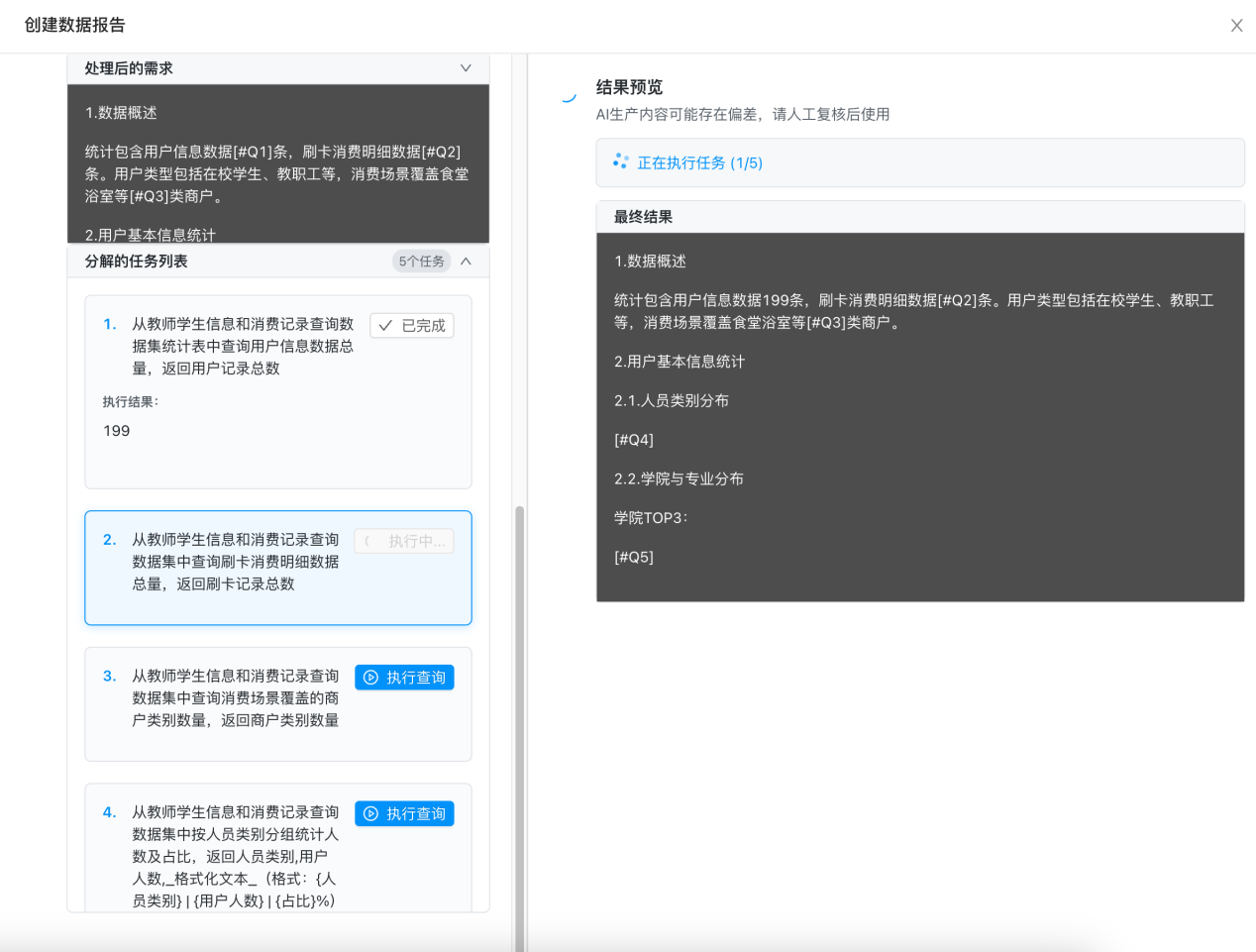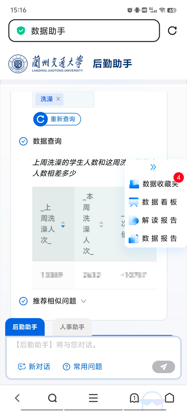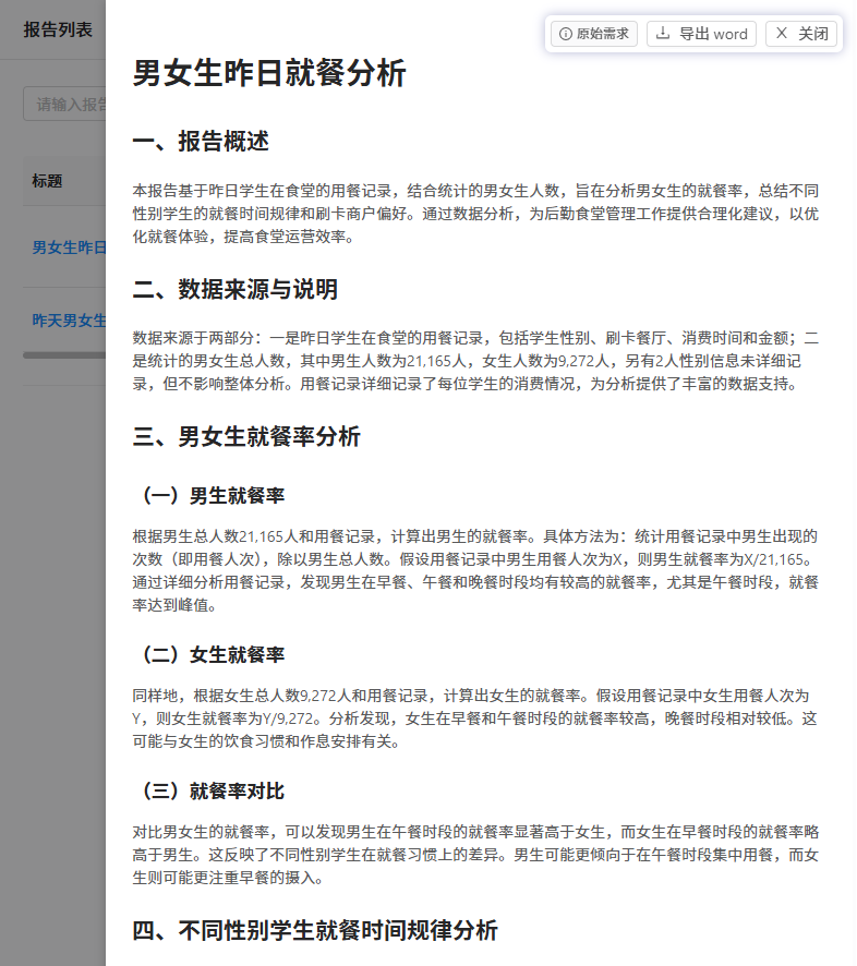 上传标准化报告模板(如《月度后勤运营分析报告》)后,系统会自动解析模板中的数据需求(如“各食堂用餐情况”“洗浴人次及消费金额”),通过问数功能获取结果并自动填充,完成后可导出报告,将报告撰写周期从传统1天缩短至10分钟。
