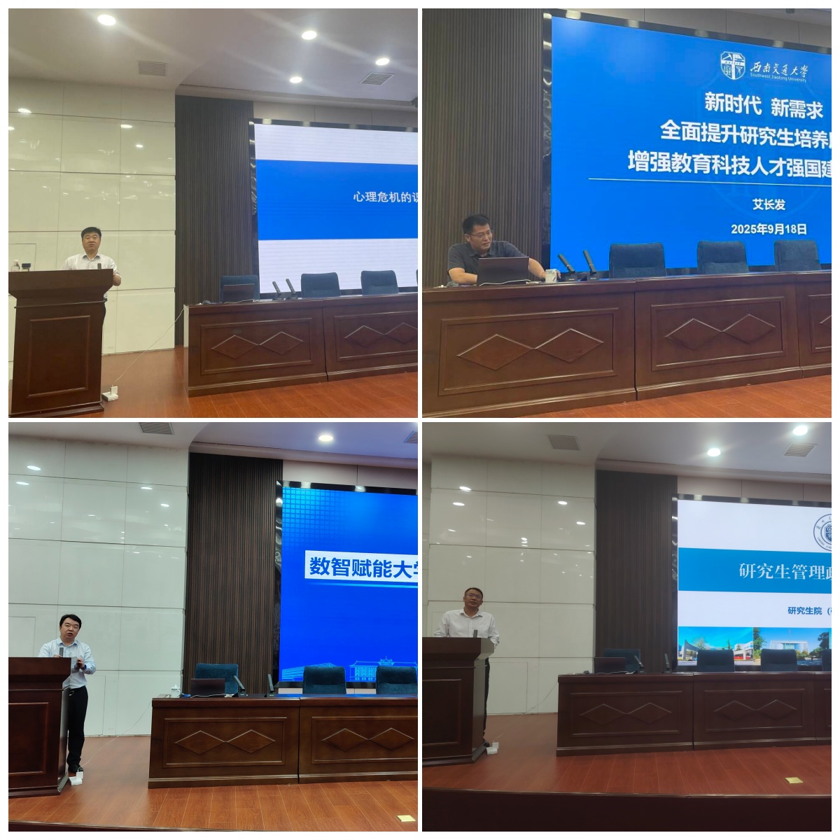 西北师范大学康廷虎教授以“理解个体差异 维护心理安全——从心理学视角认识师生关系”为题,从理解个体差异、心理危机的识别线索、心理危机的应对等三方面讲述如何维护好、解决好师生关系。西南交通大学艾长发教授以“新时代 新需求 全面提升研究生培养质量 增强教育科技人才强国建设能力”为题,讲授了我国研究生教育的改革和西南交通大学的改革举措。天津大学胡清华教授从数智赋能新质生产力、人工智能大模型时代、AI赋能大学人才培养、AI驱动第五科研范式、人机协同共治新格局等五方面作了题为“数智赋能大学人才培养和科技创新”的专题报告。学校党委研究生工作部副部长孙雷军为大家解读了我校目前研究生教育相关的政策文件。