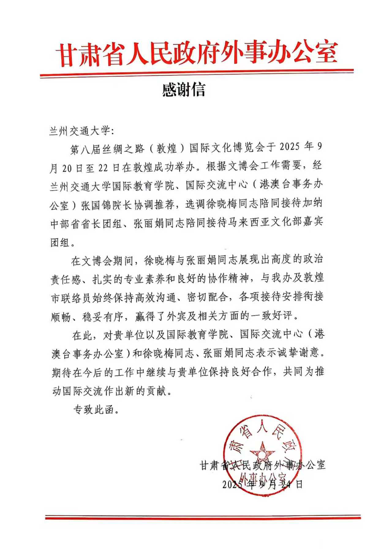 作为甘肃省重点高校,兰州交通大学长期以来始终秉持“服务地方、贡献社会”的办学理念,在国际交流合作与外语人才培养领域积累了深厚的底蕴和显著的优势。此次选派的两名志愿服务人员,正是学校优质人才培养成果的生动体现。她们不仅具备扎实的外语语言功底,能够熟练运用多语种进行精准表达,更拥有丰富的大型国际活动翻译经验,熟悉外事接待礼仪和跨文化沟通技巧。在文博会服务期间,面对高强度、高要求的工作任务,她们始终保持饱满的工作热情,全身心投入到各项服务中。在外宾接待环节,她们主动热情,细致周到,为外方嘉宾提供贴心的行程指引和信息咨询;在座谈交流和文化展览讲解等关键场次,她们凭借专业的交替传译和陪同翻译能力,精准传递双方的观点和文化内涵,巧妙化解因文化差异可能产生的沟通障碍,确保每一次交流都高效、顺畅。她们严谨务实的工作态度、专业高效的服务水平,不仅充分展现了兰州交大人的良好精神风貌,更赢得了甘肃省人民政府外事办公室工作人员以及与会外方嘉宾的一致认可和高度赞誉。甘肃省外事办公室专门对兰州交通大学的大力支持表示衷心感谢,并对两位翻译人员的出色工作给予了“专业素养过硬、服务能力突出”的高度评价。