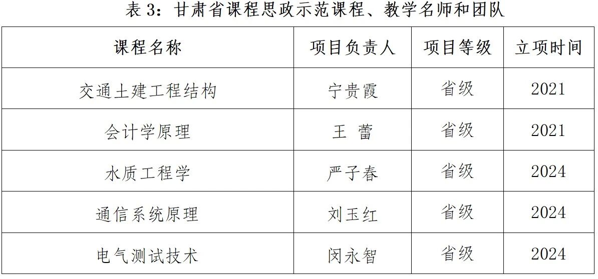 为扎实推进课程思政建设及教育教学改革,把思想政治教育贯穿于人才培养全过程,有效促进人才培养质量的全面提升,学校持续加强课程思政示范项目建设。近5年来,学校获批“甘肃省课程思政示范高校”,获批1个“甘肃省课程思政教学研究示范中心”,3个专业获批“甘肃省课程思政示范专业”,5门课程获批“甘肃省课程思政示范课程、教学名师和团队”,18个专业获批“校级课程思政示范专业”,75门课程获批“校级课程思政示范课程、教学名师和团队”,3个校级课程思政教学研究示范中心获批立项建设。