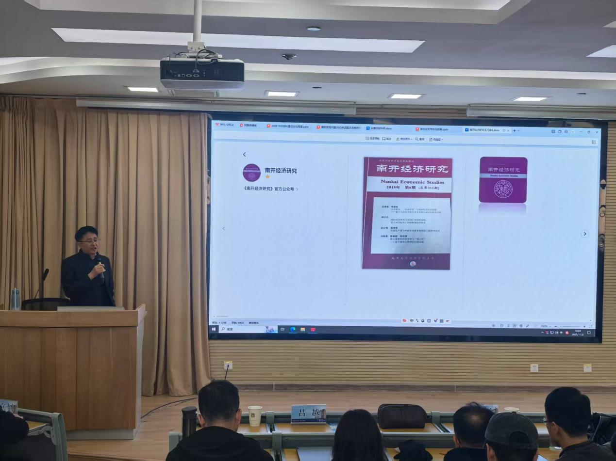 《南开经济研究》编辑部主任、南开大学经济学院王乃合教授介绍了《南开经济研究》的办刊宗旨和选稿要求,并作了题为“从模仿到科研”的专题报告。他指出,优秀的学术论文应具备创新性、现实性与逻辑性等核心特质,并深入剖析了当前研究中普遍存在的“简单模仿”现象及其局限。在此基础上,重点探讨了如何通过制度背景梳理、理论与实证融合以及批判性思维等方法提升研究深度,实现从“精致的平庸”到“创新性学术论文”的跨越。报告强调,学术研究应注重跨学科视野、夯实经典理论素养、持续学习前沿研究方法,鼓励青年学者扎根中国实践,构建自主的知识体系,真正做到“把论文写在祖国大地上”。