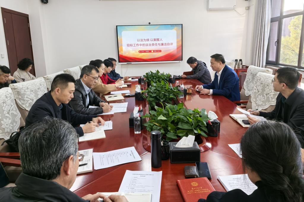 为深入学习贯彻习近平法治思想,健全领导干部学法用法长效机制,提升学校各级管理人员运用法治思维和法治方式防范风险、推动工作的能力。11月13日,校党委常委、副校长朱廷珺在行政楼324会议室主讲《以法为纲 以案醒人——招标工作中的法治责任与廉洁自律》专题法治课。图书馆、档案馆、土木工程学院、经济管理学院、铁道技术学院相关负责人,招标中心全体职工共同参会学习。
