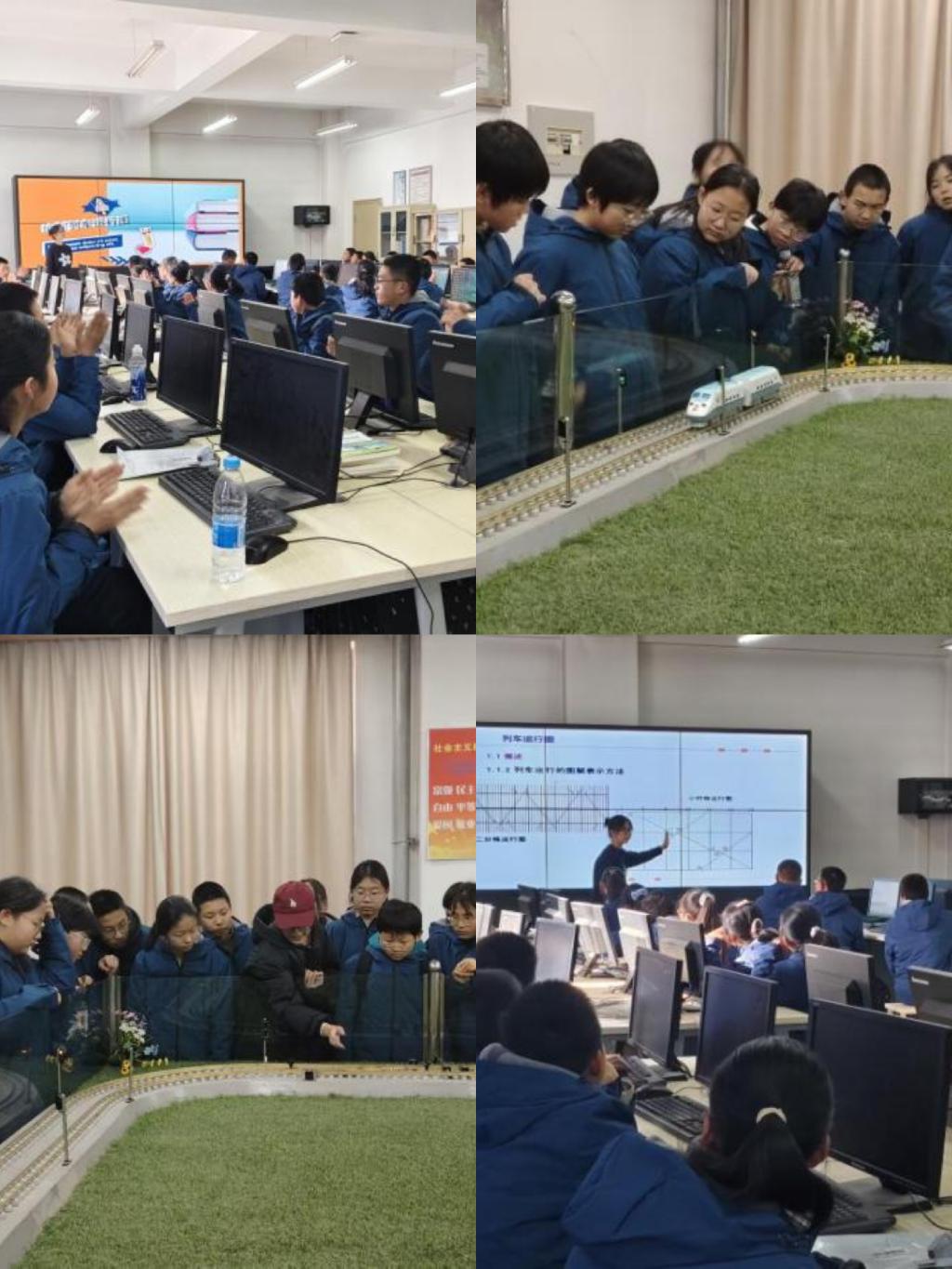 以科普研学为载体,筑牢智育根基,激活探索潜能。在铁路运输科技馆的四大特色实验室里,科技的魅力被层层解锁。铁路车站接发列车模拟实验室中,同学们在志愿者指导下亲手操作设备,完成进路办理与接发车全流程,让行车组织原则转化为眼前真实闪烁的信号与规程;客运站运转作业虚拟仿真实验室里,复杂的客运组织知识通过生动故事娓娓道来,同学们在“角色扮演”中体验客运服务的乐趣,感受保障运输有序的责任;列车运行控制模拟实验室的巨大沙盘上,蜿蜒的铁路线、清晰的信号机与转辙机,伴随着列车模型的缓缓行驶,直观呈现轨道交通“大脑”与“神经”的运作机制,点燃了大家的探索热情;列车运行图编制综合实验室中,“小明的旅行”情境探索让同学们学会绘制运行图,在一笔一划间锻炼逻辑思维与团队协作,深刻理解铁路“时刻宪法”的核心价值。