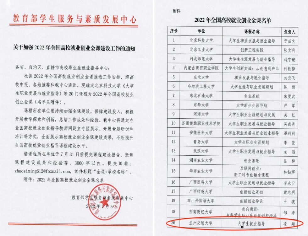 1.聚力金课建设,树立质量标杆。 整合校内外优质资源,精心打造《大学生就业指导》等课程群,年覆盖学生近1.6万人。2022年,核心课程成功获评教育部全国就业创业“金课”,是西北五省唯一获此荣誉的高校,成为课程建设的标志性成果。