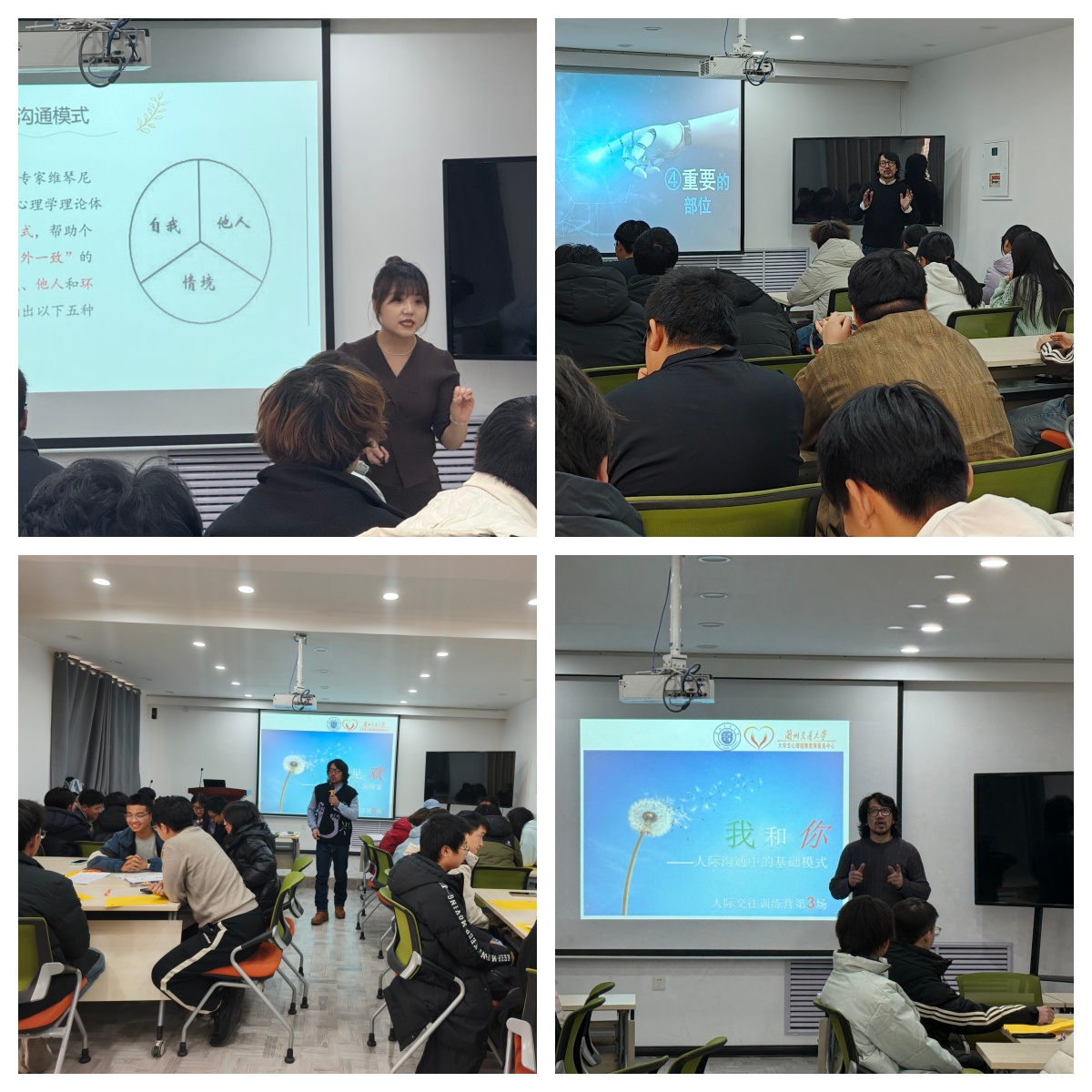 前期,大学生心理健康教育服务中心通过问卷调查、学院座谈、班级访谈等多种形式,以土木工程学院、环境与市政工程学院、数理学院为试点,针对学生在人际交往中存在的沟通障碍、协作困惑、边界模糊等共性问题,团队量身定制了训练营课程体系,摒弃单一理论宣讲模式,将服务场景从封闭咨询室延伸至贴近学生生活的“一站式”学生社区,打造沉浸式成长空间。活动以“解决真实人际困惑、提升实用沟通技能”为核心目标,设计了“读心识人”专题讲座、“我说你画”沟通互动、“我和你”情境模拟、人际交流“雕塑”感悟等多元化模块,将抽象的心理学原理转化为可操作、可体验的实践技能,让学生在亲身参与中破解人际难题。
