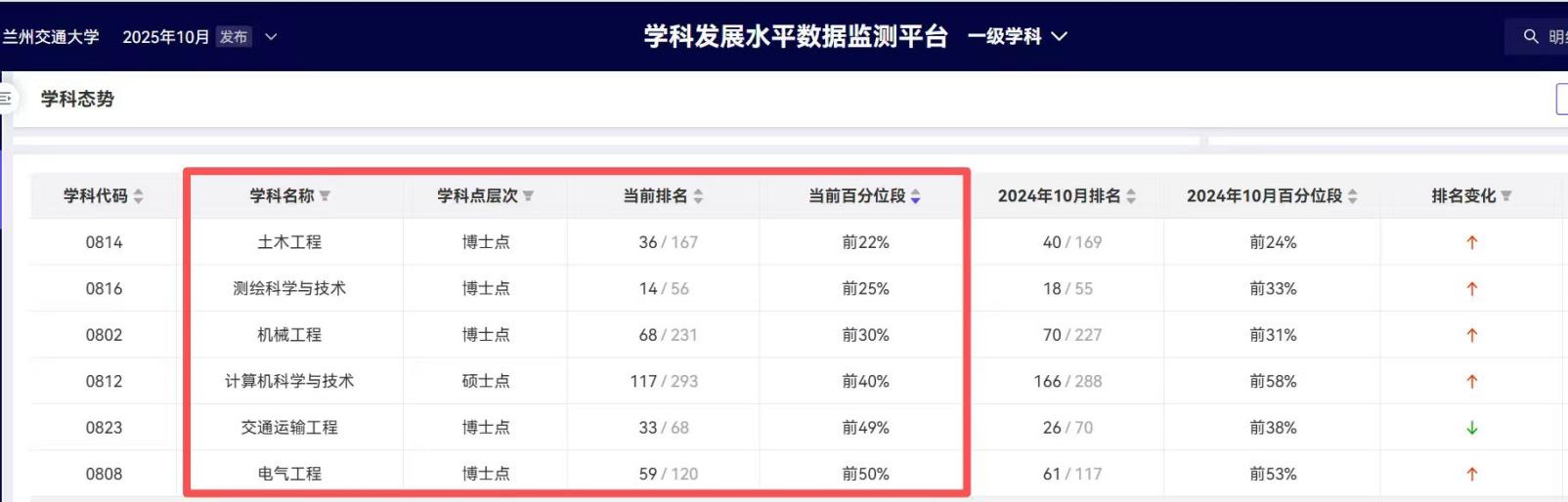 继工程学、化学后,材料科学、环境与生态学2个学科进入ESI全球排名前1%。2025年10月15日,全球领先的高等教育评价机构——软科正式发布“2025软科中国最好学科排名”,兰州交通大学的测绘科学与技术、土木工程、机械工程、计算机科学与技术、交通运输工程、电气工程等6个学科上榜,上榜数量较上一年度增加2个(电气工程、计算机科学与技术)。“计算机科学与技术”提升18个百分点、“测绘科学与技术”提升8个百分点、“电气工程”提升3个百分点、“土木工程”提升2个百分点、“机械工程”提升1个百分点,兰州交通大学学科整体实力呈逐年稳步上升趋势。