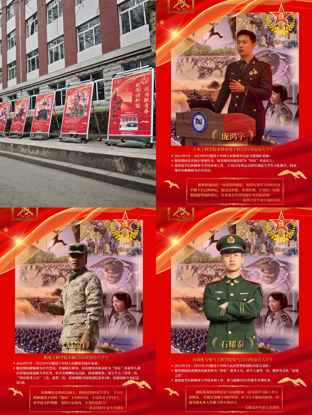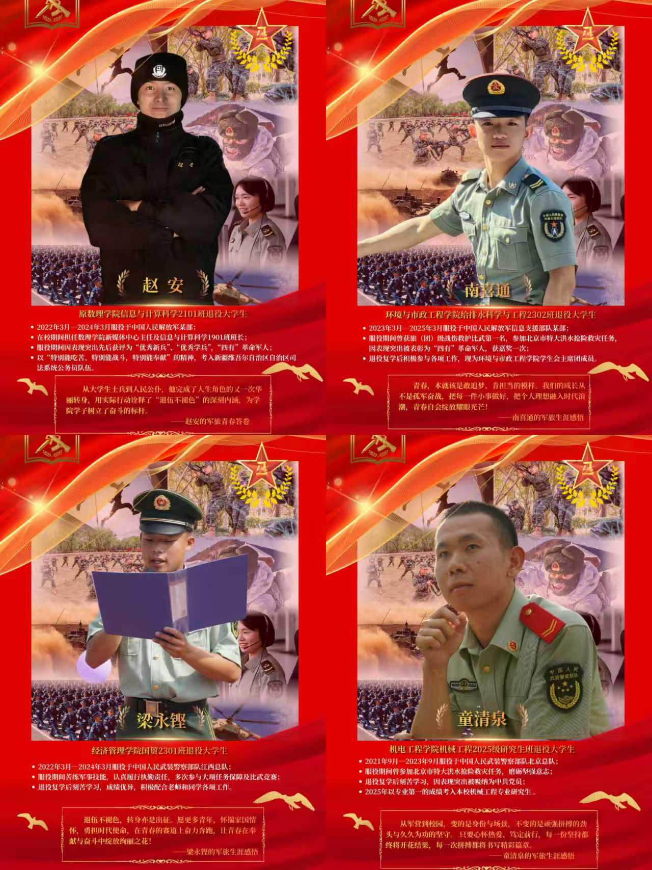 在第五教学楼前的展览现场,19位退役大学生的风采展板依次排开,构成了一道独特的风景线。他们中,有曾服役于边疆一线、在艰苦环境中磨砺意志的戍边卫士;有在重大演训任务中表现突出、屡获嘉奖的技术尖兵;也有在抢险救灾一线冲锋在前、守护人民群众生命财产安全的钢铁战士。如今,他们光荣退役,重返校园,有的在专业学习上刻苦钻研、成绩优异,有的在志愿服务中无私奉献、勇于担当,有的在学生工作中积极作为、服务同学,将部队的优良作风带到了学习生活的方方面面。