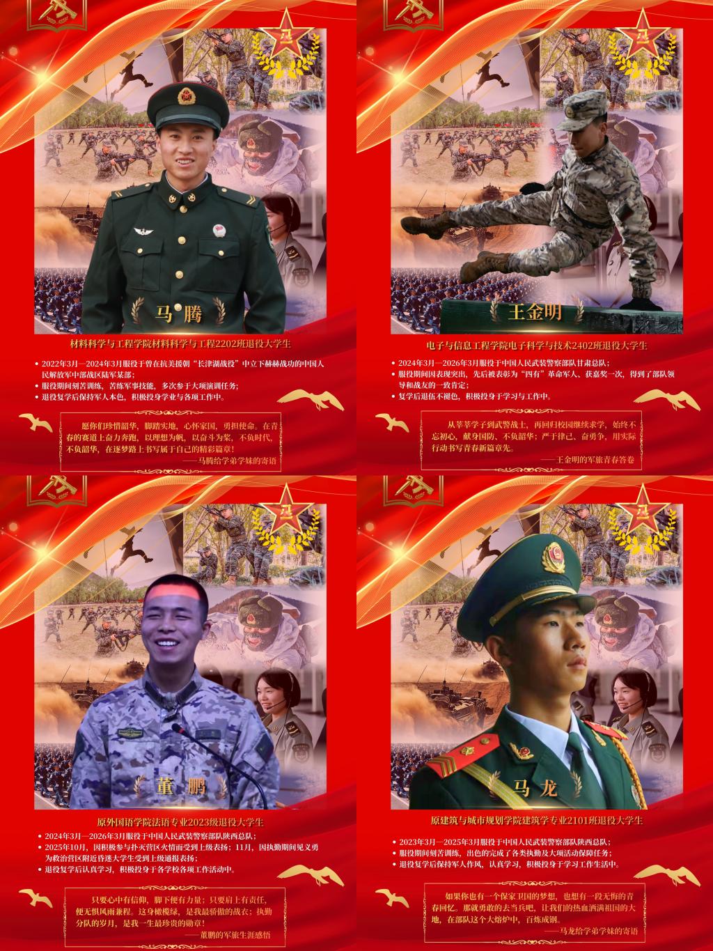为充分展现我校退役大学生士兵“退伍不褪色、返校立新功”的昂扬风貌,以榜样力量激发广大学子投身国防、报效祖国的家国情怀,近日,由学生工作部(处)、党委人民武装部举办的退役大学生风采展示活动在师生中引发热烈反响,也为2026年下半年征兵工作营造了浓厚氛围、注入了强劲动力。