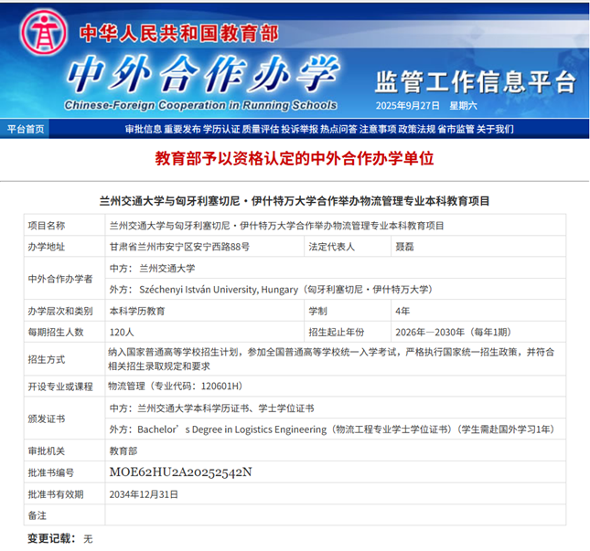 平台建设实现突破,“国家铁路局高原铁路运输智慧管控铁路行业重点实验室”成功获批,建成“铁路运输智能综合调度中心”“高原环境模拟试验舱”等一批高水平科研平台,为学科创新提供坚实支撑。国际化办学迈出关键步伐,与匈牙利塞切尼·伊什特万大学合作的物流管理专业本科教育项目正式获批,成为学校首个、西北地区首个物流类中外合作办学项目,开创了面向“一带一路”的国际教育合作新模式。