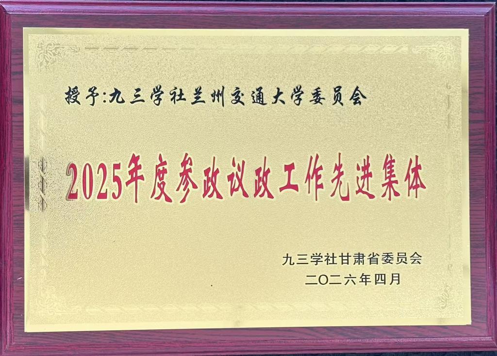 近日,九三学社甘肃省委员会2026年参政议政工作会议在兰州召开。会议全面总结了2025年度参政议政工作,安排部署了2026年度工作要点,通报了2025年度社情民意信息工作情况,表彰了2025年度参政议政工作成绩突出的先进集体和先进个人。九三学社兰州交通大学委员会荣获“2025年度参政议政工作先进集体”称号。